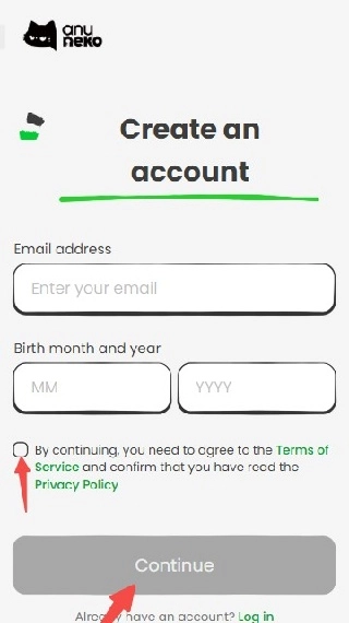 1. 先打开应用程序或访问网站,点击Sign up按钮,填写电子邮箱和出生日期、勾选同意条款后,点击底部的Continue。