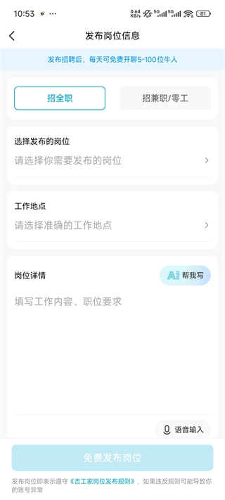 5、选择发布的岗位、地点、内容点击发布即可