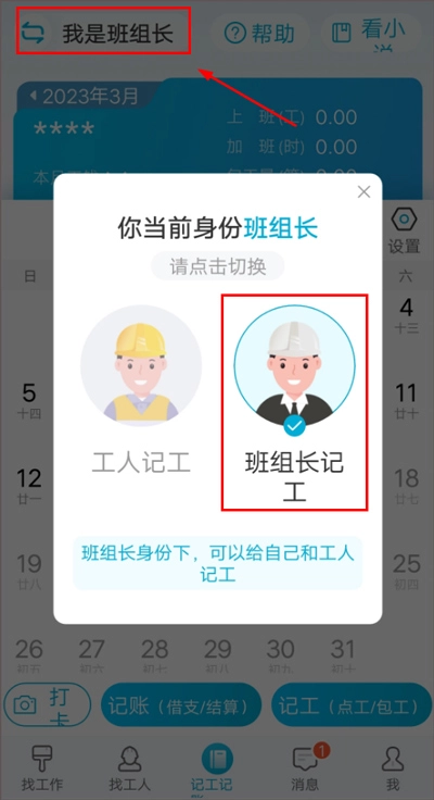 (1)在记工日历页的左上角,先把你的身份设置为[我是班组长],接着点击[记工]按钮。