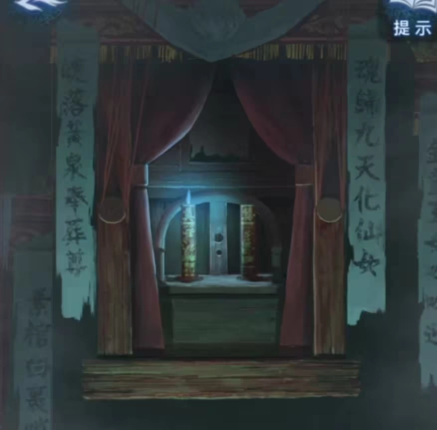 到达【六礼轩】后桌子上拿到【纸剪刀】,估计还是要给自己烧纸了,查看一下左上角,放上【喜烛】后提示可以左右拖动,拖到最左边的时候可以看到墙上画了个提示,祭奠的话是要点亮蜡烛的,喜事要熄灭蜡烛,按照这个规则我们点一下蜡烛分别是【亮-灭,灭-亮,亮-灭,灭-亮】