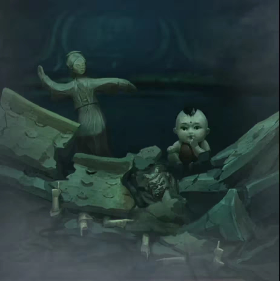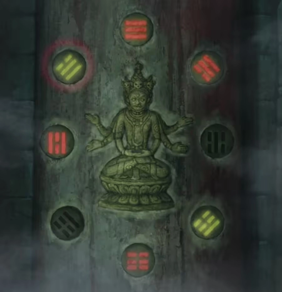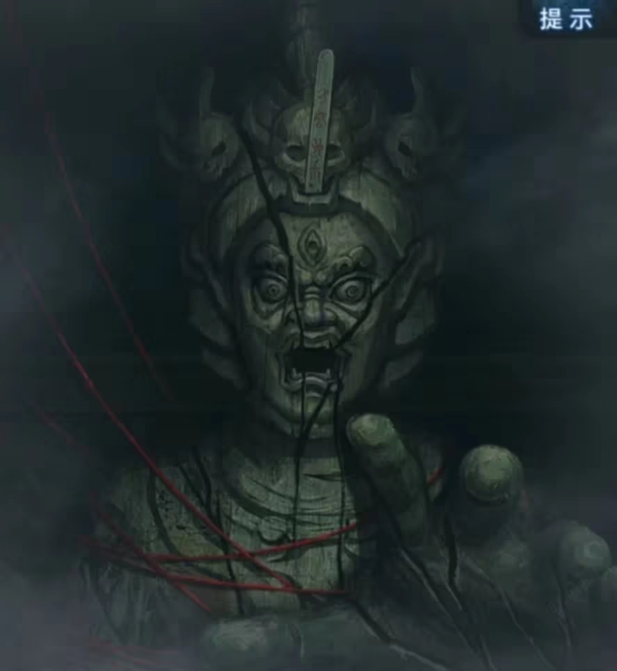 查看左侧的六葬菩萨机关,按图示调整六个线索的颜色,打开棺材后会发现另一尊木头六葬雕像。再次将【木签】插入雕像,即可获取【一贯古钱】。随后切换至大地图,前往【山洞】将【一贯古钱】交给聂莫黎,从而得到【铜钱剑】。接着切换大地图来到【奉奘祠】,对金属雕像使用【铜钱剑】——需要注意的是,使用后会触发一个手动点击断头的小游戏,体验相当畅快!本章至此结束!