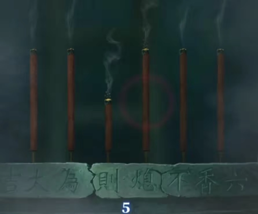 再次打开大地图前往【山洞】,与聂莫黎对话后,把【朱砂囊】和【木头枪】交给她——这难道不就是木头和朱砂吗?随后便能获得【竹签】。接着打开大地图切换到【六礼轩】,对六葬菩萨的雕像使用【竹签】将其击碎,拿走雕像前的【三炷香】。之后切换大地图来到【称骨斋】,把【三炷香】全部放入右边的香炉中,就可以开始玩小游戏了。