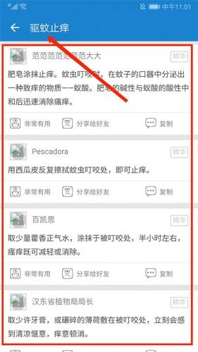 在【驱蚊技巧】界面,这里有不少真实用户分享的驱蚊方法,你可以参考借鉴,也能选择分享给好友。