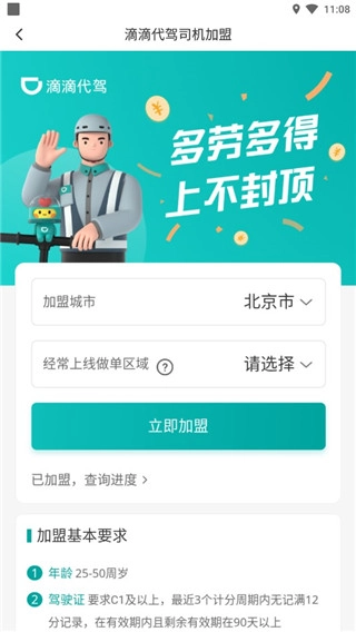 请先安装滴滴代驾司机客户端的最新版本应用。打开应用后,若您已有账号,可直接登录;若您是新用户,请点击页面下方的【立即加盟】按钮,完成注册申请流程。