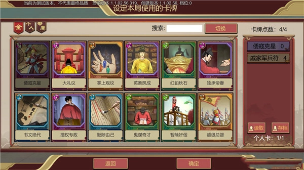 根据当前游戏玩法的需求,需合理搭配【个人卡】与【专属卡】,同时要留意总点数不得超出上限。点击左侧的卡牌就能将其添加到本局游戏中,系统支持保存配装方案,方便下次快速选用。