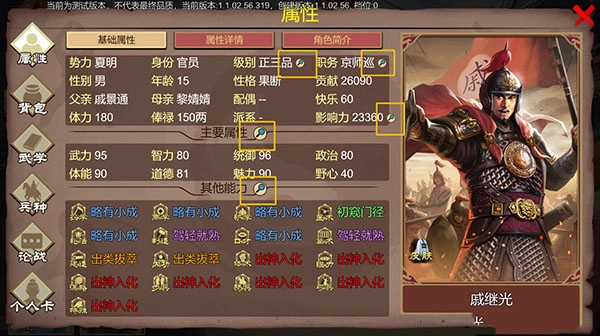 点击界面左上角的头像,能够查看人物属性、背包物品、武学调整、兵种解锁等功能。点击文字旁边的放大镜图标,就能获取更详细的说明。人物属性分为基础属性与其他能力,具体含义在游戏内都有详细解释。