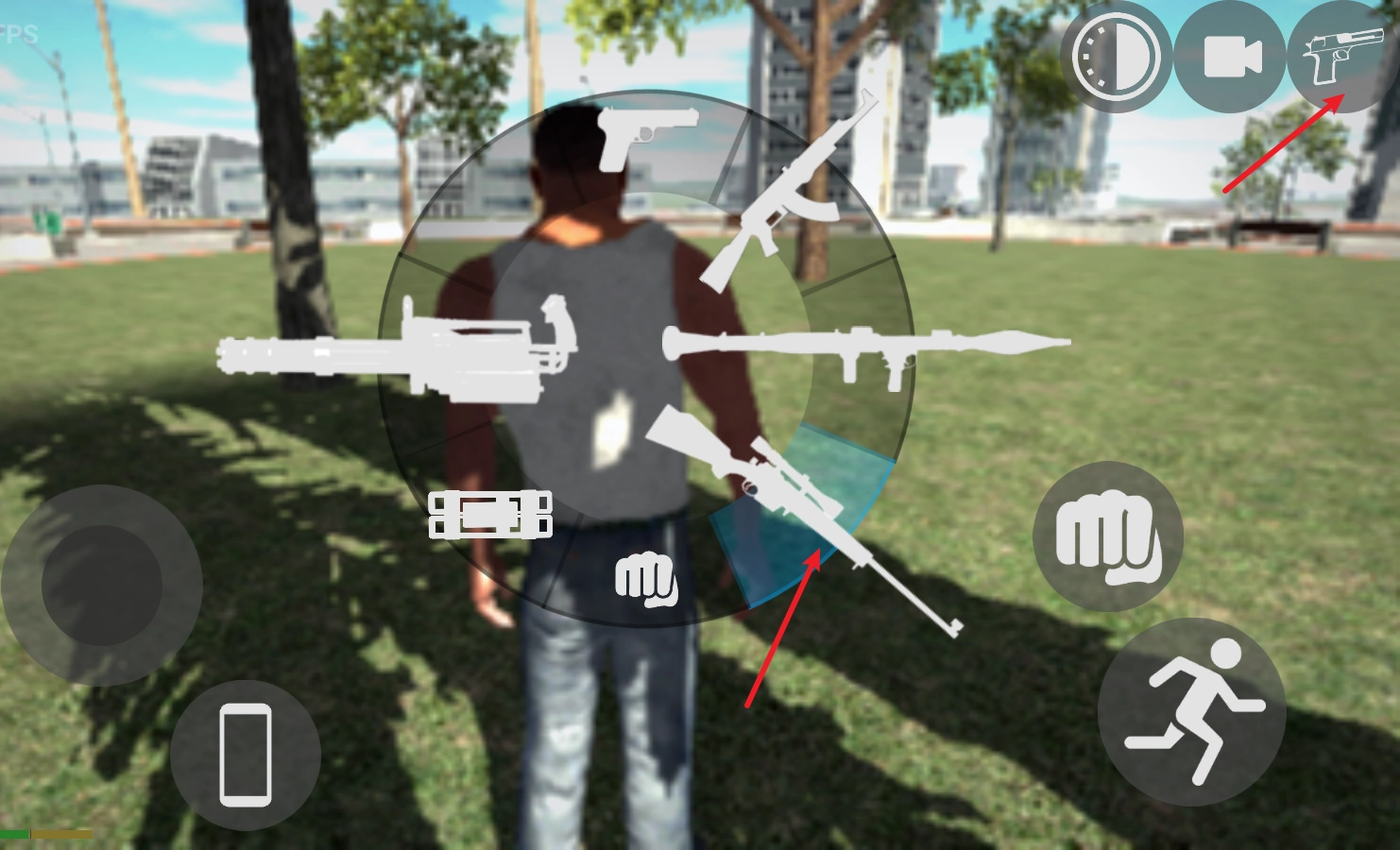 点击右上角的手枪按钮,可以自由的切换各种武器。
