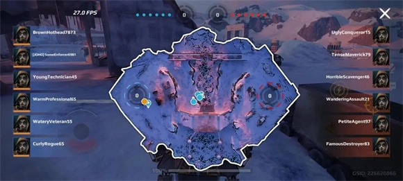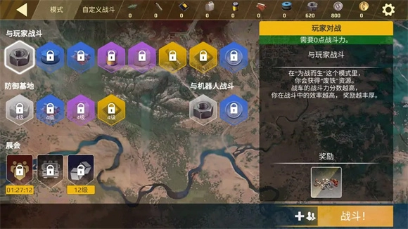 如图所示,战斗选择界面主要包含三个部分:玩家对战、基地防御、机器人对战,另外还有乱斗性质的“展会”模式。一般来说,“基地防御”和我们常说的PvE玩法比较接近——敌人会定时出现,玩家需要守护指定的目标区域。