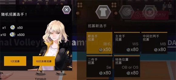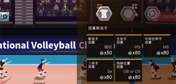 在主界面点击商店即可进入球员招募界面,这里提供五种招募途径,具体包括随机招募、主攻手招募、拦网手招募、二传手招募以及特殊位置招募,其中后四种招募方式所需的资源相对更多。
