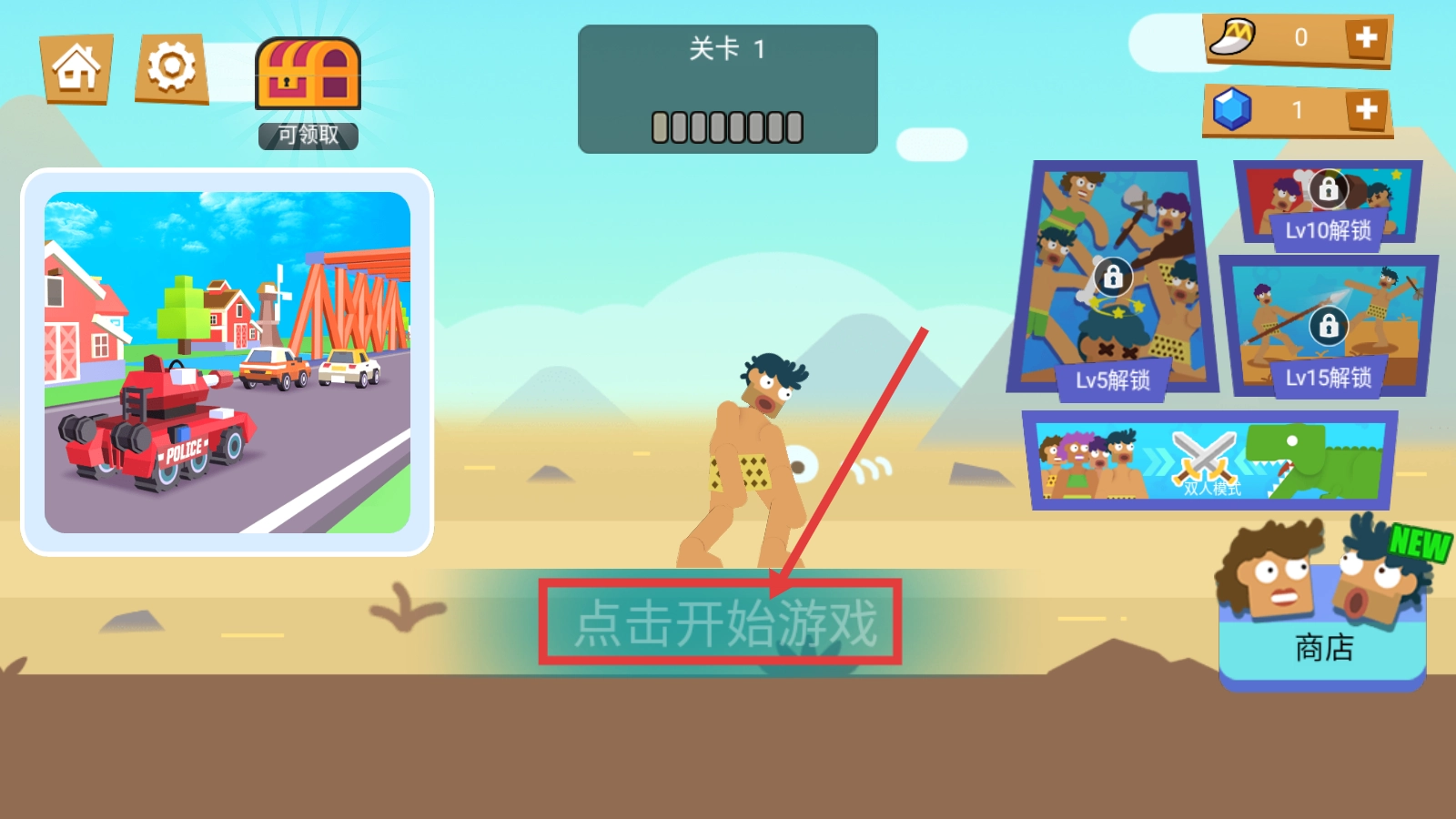 进入游戏后,在【关卡1】界面点击【点击开始游戏】按钮,就能看到右侧Lv5、Lv10等需要解锁的内容,等熟悉界面后就可以开启战斗了。