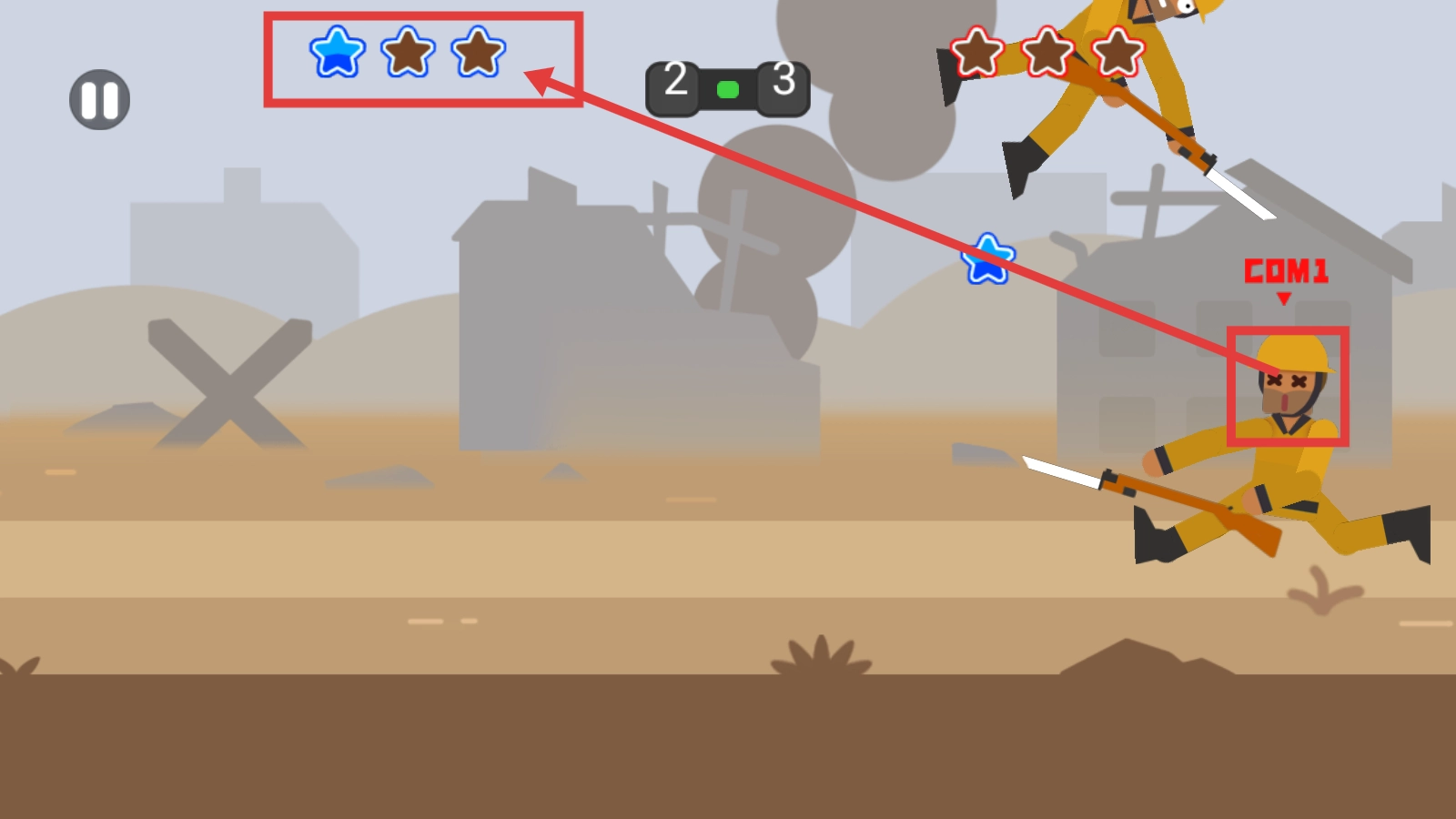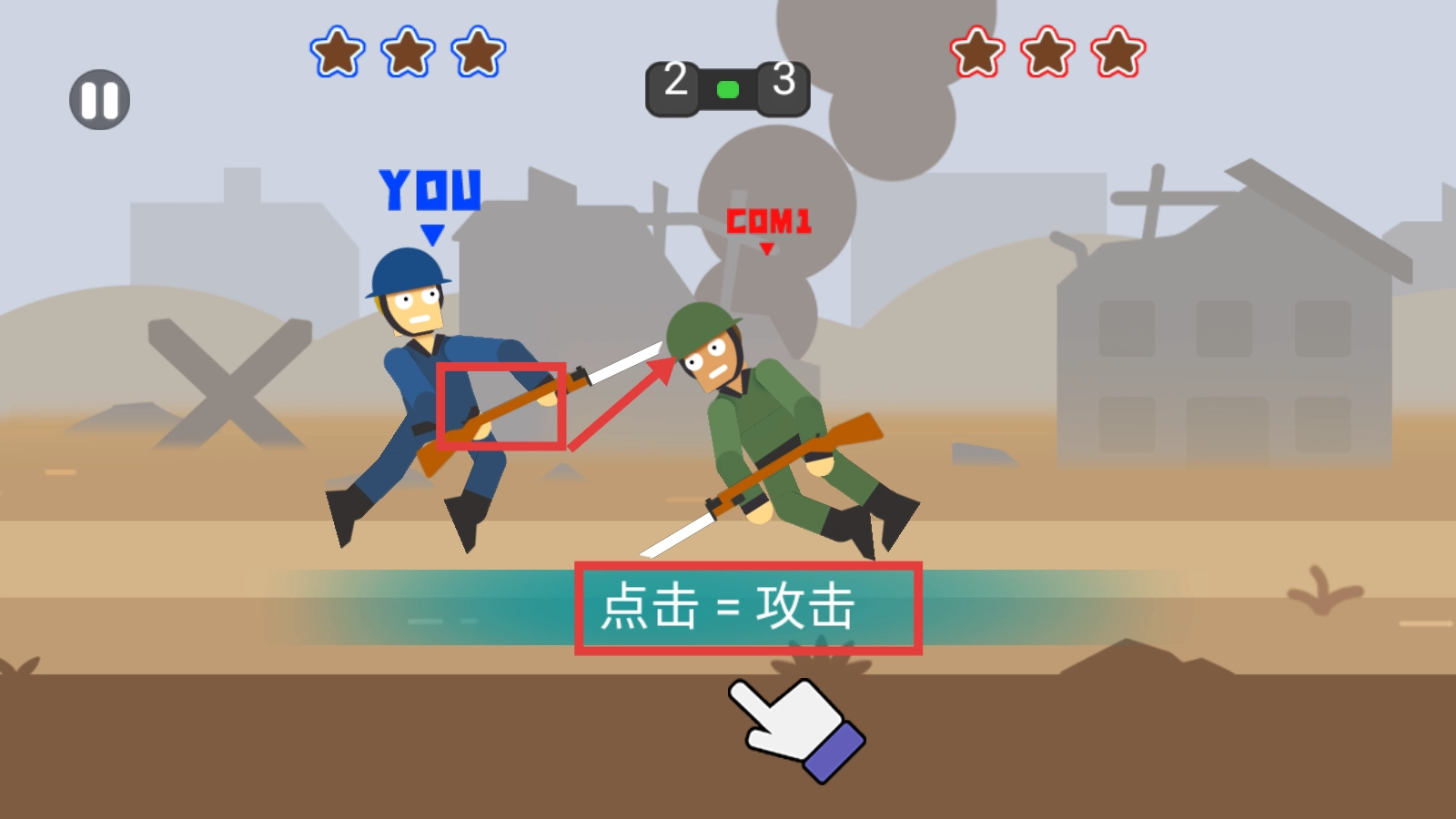 战斗时,你需要操控自己的士兵。当看到【点击=攻击】的提示时,点击屏幕就能发起攻击,系统会优先锁定敌方的【COM1】士兵进行攻击,这样可以帮助积累战斗经验。