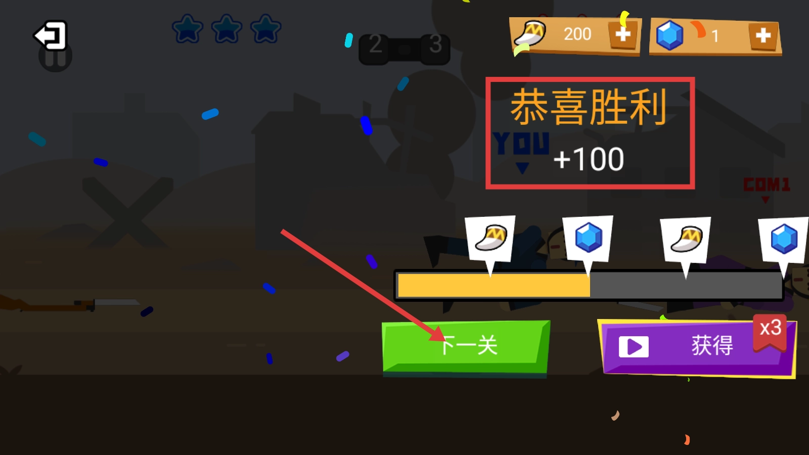 通关成功后会弹出【恭喜胜利】的界面,同时能获得【+100】的奖励,点击【下一关】按钮即可继续挑战,积累的资源可以用来解锁新角色或者升级装备。