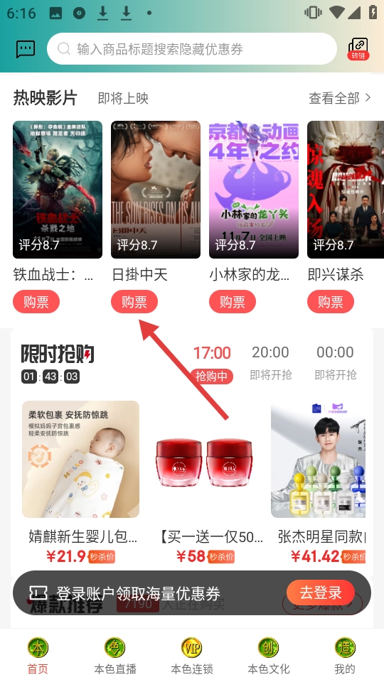 在应用首页的【热映影片】区域,找到影片《日掛中天》,然后点击对应的【购票】按钮。