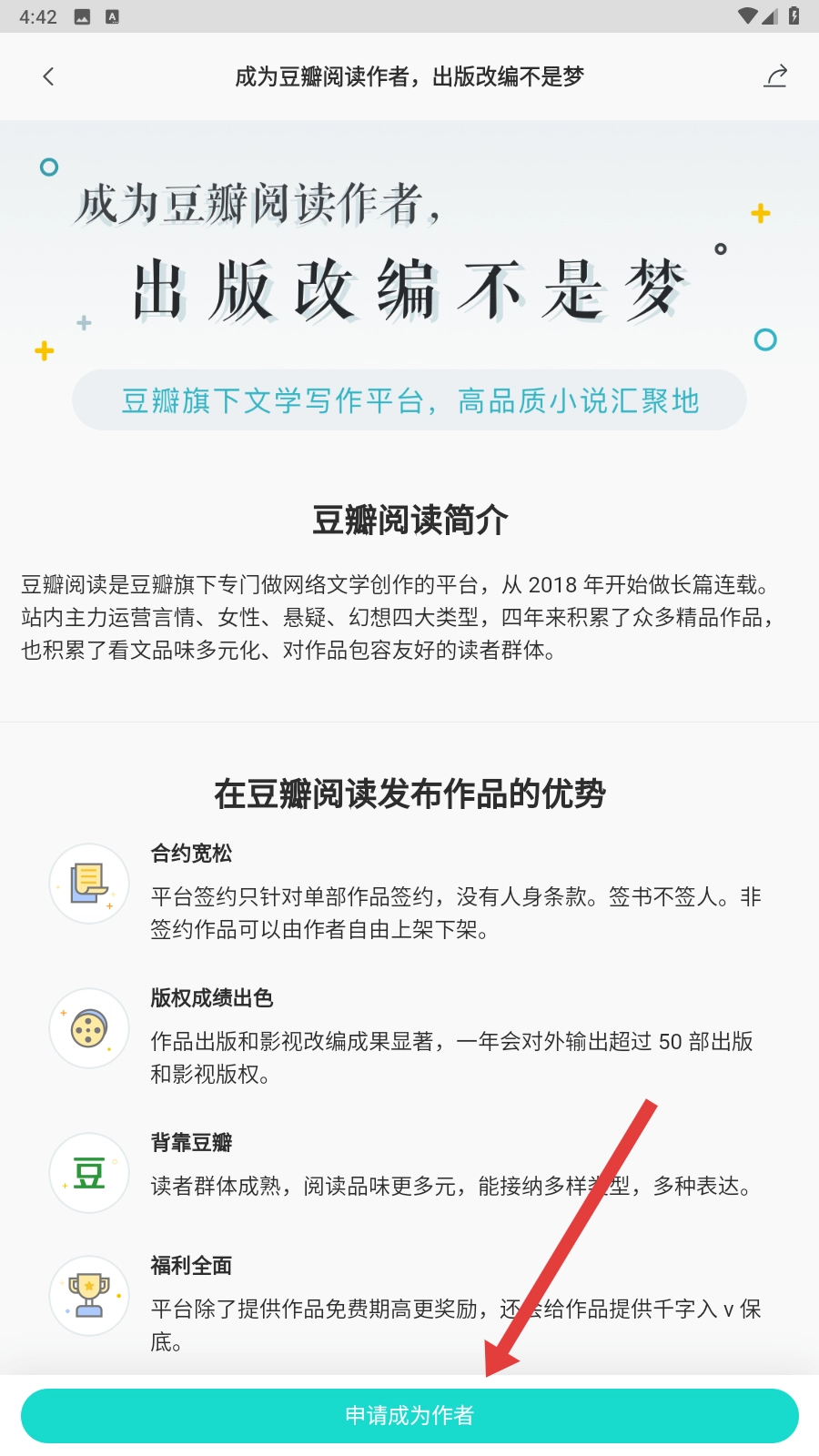 进入作者申请页面后,点击【申请成为作者】按钮,就能进入下一步操作啦。