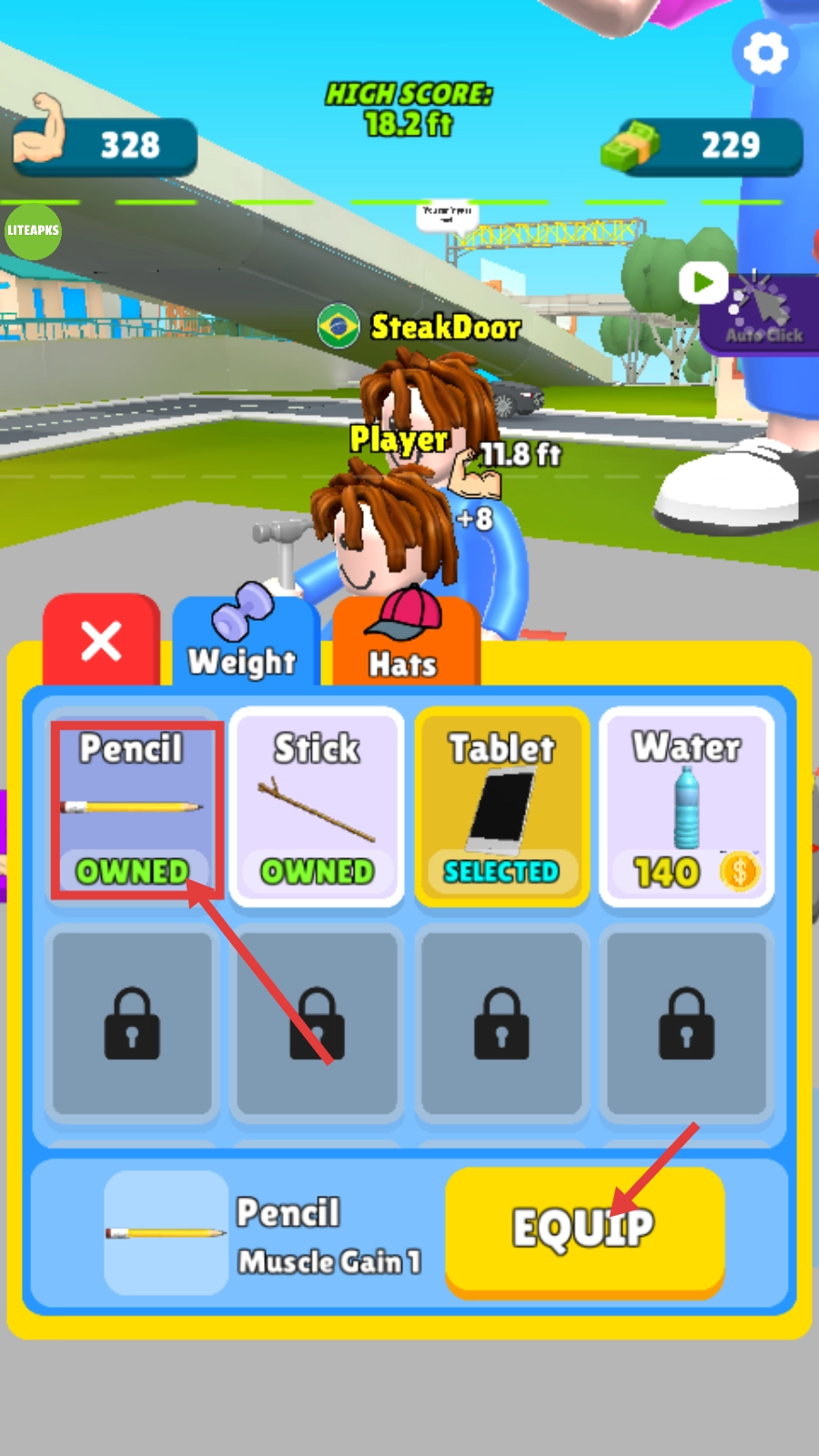 装备【Pencil-OWNED】后点击【EQUIP】按钮,可提高肌肉获取效率,为角色成长提供助力。