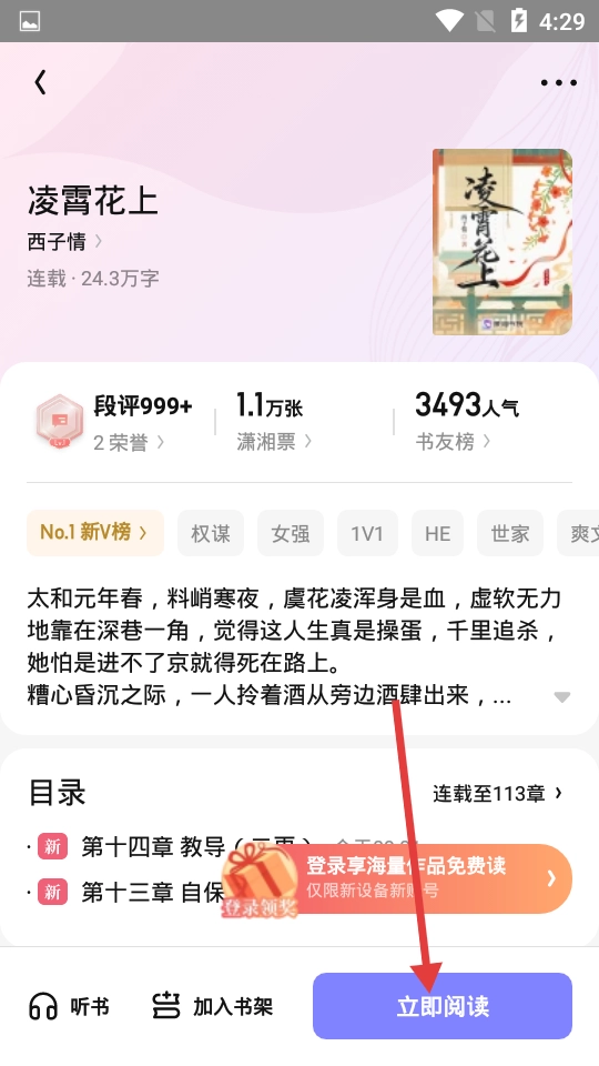 在凌霄花的详情页面,点击【立即阅读】按钮,即可开启阅读之旅。