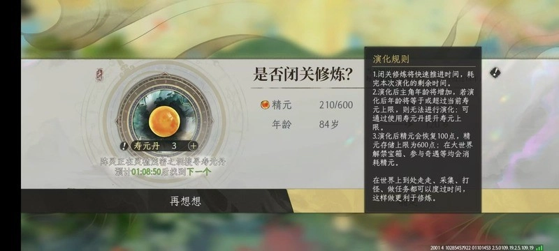 每个演化周期设定为50年,一旦精元消耗殆尽,即可通过闭关恢复精元,无需顾虑剩余的演化时间是否用完。若始终不进行闭关,长时间进行走路、采集、打怪等活动,会导致时间缓慢流逝,同样会触发闭关机制。闭关结束后,精元将得到恢复,世界资源也会随之刷新。