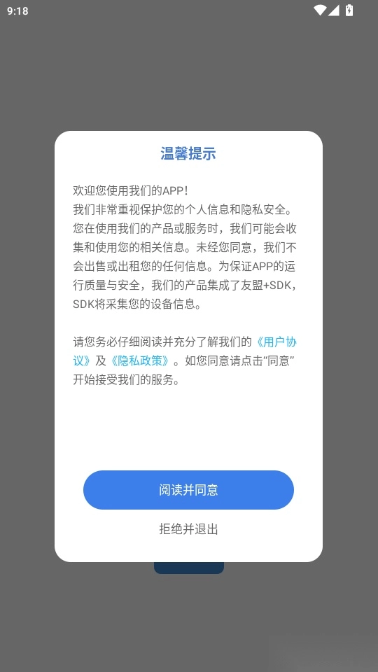 打开软件阅读“温馨提示”点击“阅读并同意”进入