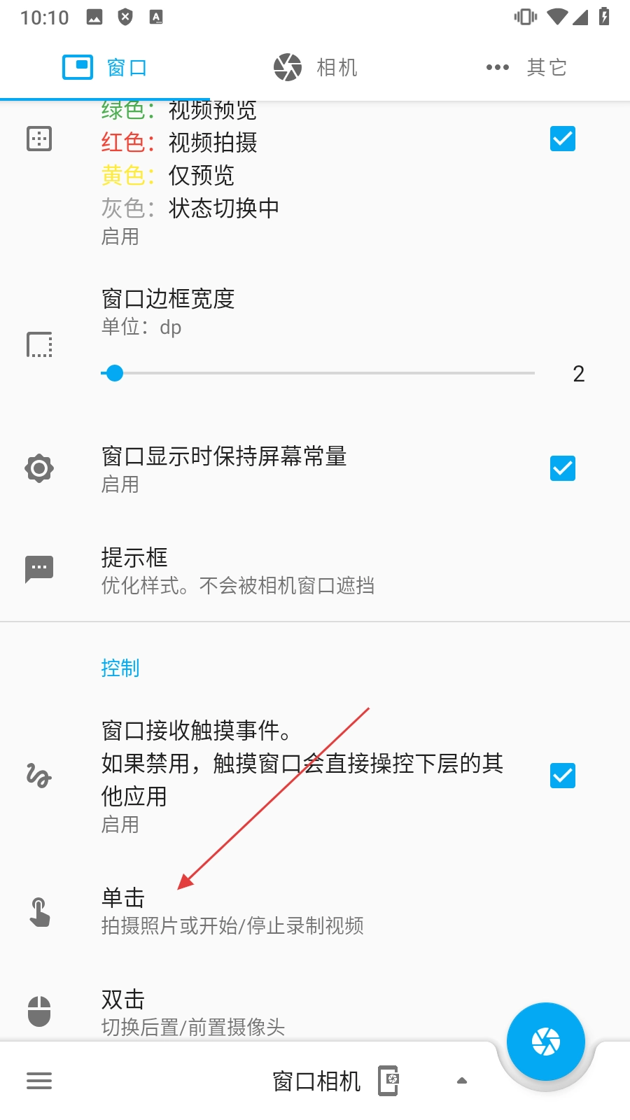 在页面里选择【切换后置/前置摄像头】,就能完成单击功能的设置。