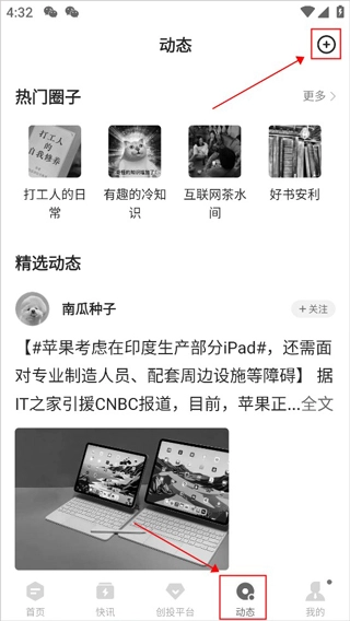 点击底部导航栏切换至“动态”板块,再点击右上角的“+”按钮,即可进入动态发布页面。