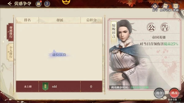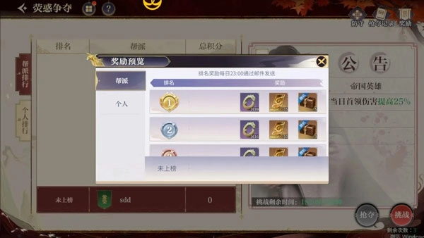每天19点至23点是个人抢分时段,仅参与过首领挑战阶段的玩家方可进行抢夺操作。