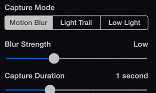 3、点击左下角拍摄按钮,可选择不同拍摄模式,包括动态模糊、灯光轨迹与弱光模式,分别适合不同拍摄场景。
