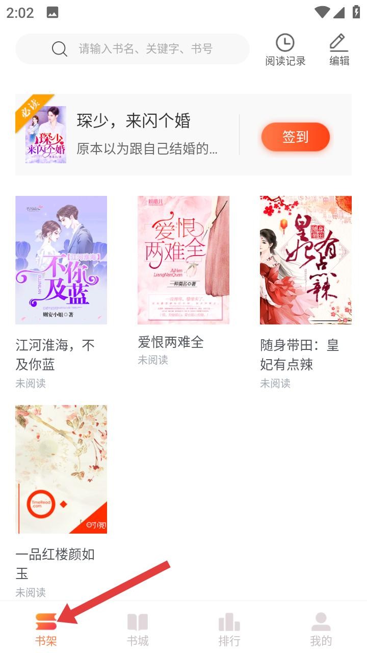 3、书架页面顶部设搜索、阅读记录与编辑功能,展示琛少来闪个婚等书籍及未阅读状态,底部导航关联书城、排行,助力用户便捷管理阅读书单。