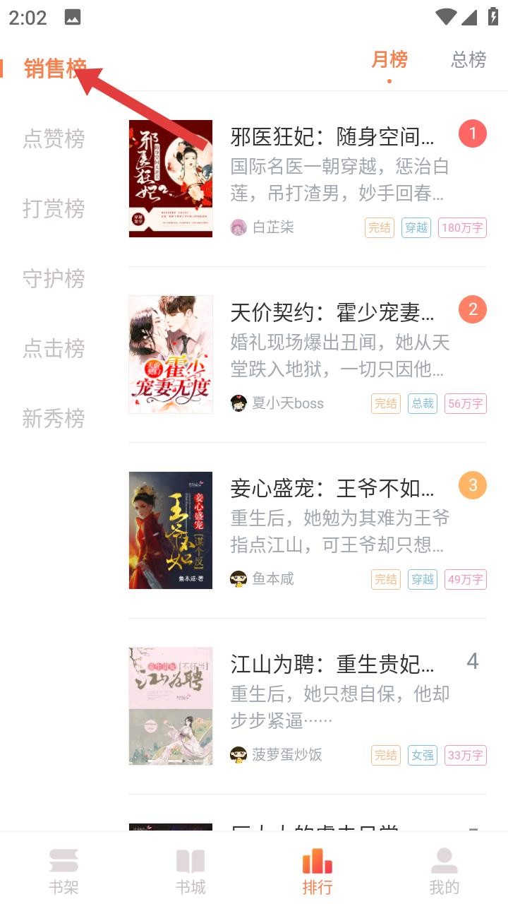 2、排行页面左侧划分销售榜、点赞榜等榜单,右侧月榜陈列邪医狂妃等小说,标注作者、字数与题材,方便用户按热度筛选,快速发现优质作品。