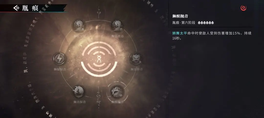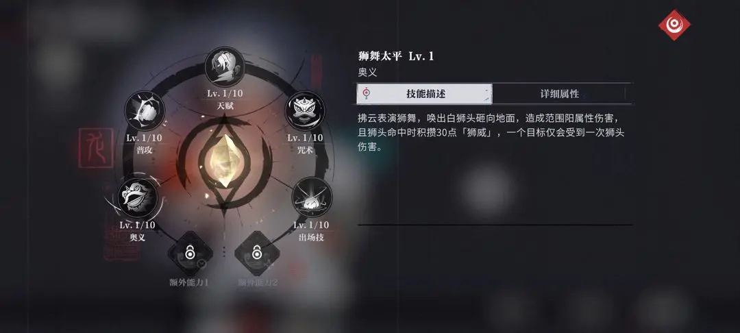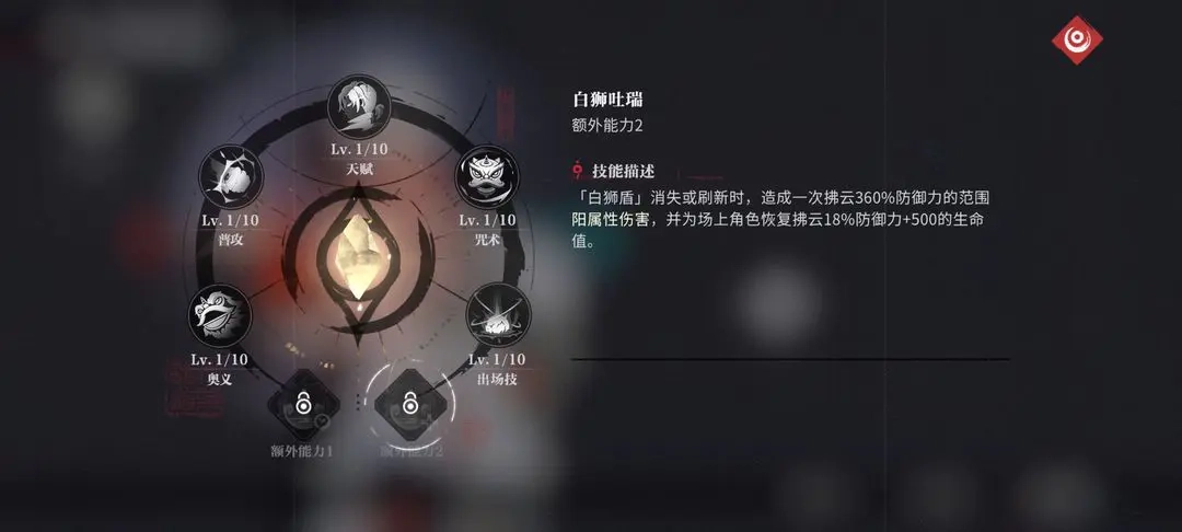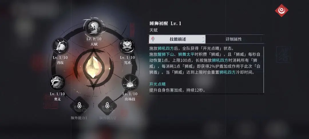 使用咒术可让全队进入[开光点睛]状态,从而获得28%的伤害提升;此外,释放出场技与奥义时会积攒[狮威],该[狮威]每秒自动回复1点,上限为100点。长按咒术时会消耗[狮威],每消耗1点就能获得2%的护盾加成,此加成上限为200%;当[狮威]积满时,将重置咒术的冷却时间。