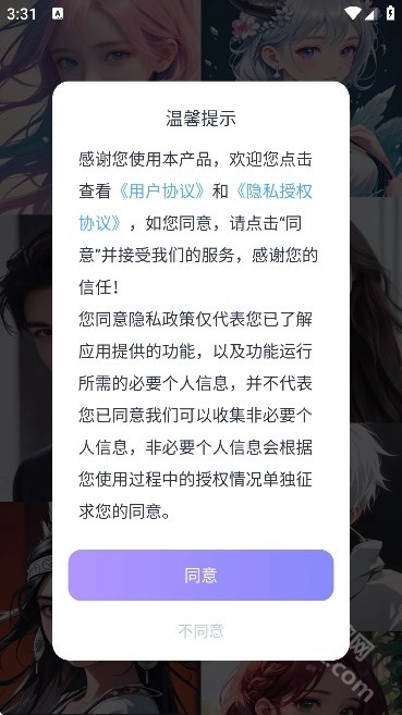 打开AIHoney聊天软件后,需要先同意用户协议与隐私政策。