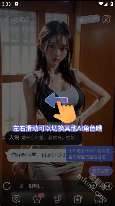 挑选你感兴趣的角色进入聊天对话页面,能够通过左右滑动来切换其他AI角色。