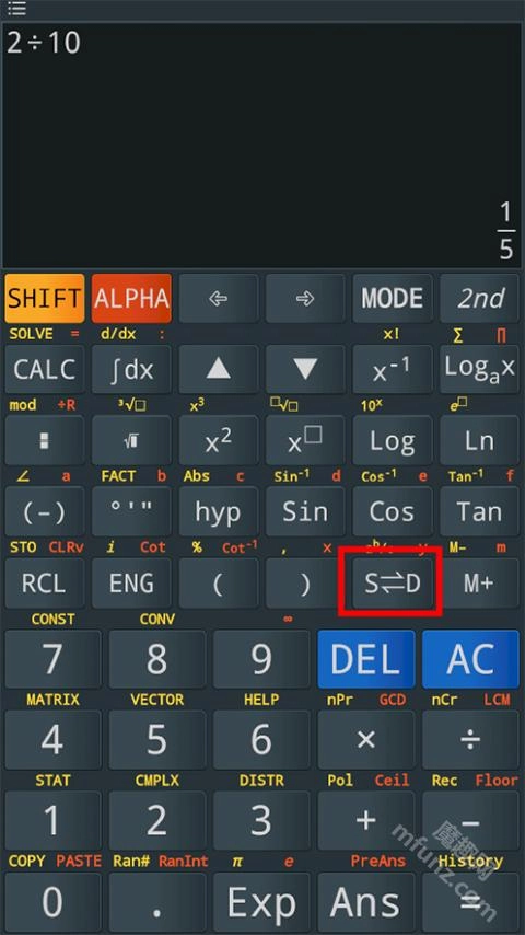 在做除法运算时,只要按下键盘上的小数/分数切换键(红色方框标注的区域),就能把分数转化成小数形式。