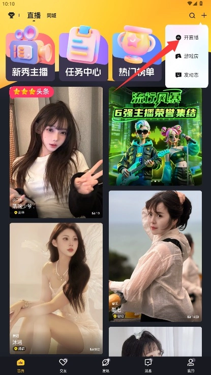 在直播界面点击右上角的加号按钮,然后从弹出的菜单里选择开直播的功能入口。