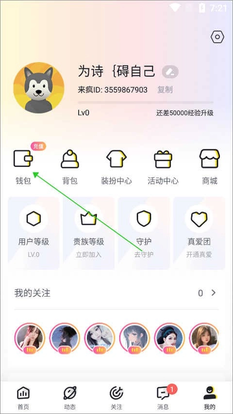打开并登录来疯直播,进入我的页面中点击【钱包】