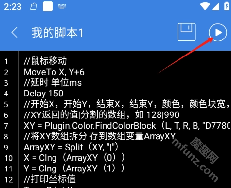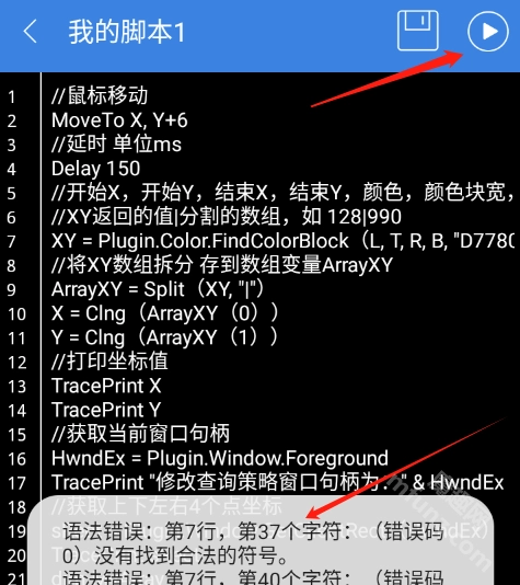 为了方便演示,我写了一个简单的游戏脚本代码供你参考。代码编写完成后,点击页面右上角的“运行”按钮即可。
