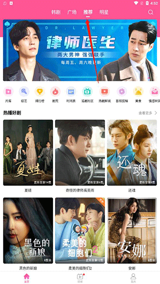 1、在app首页中有四大版块,分别是韩剧、广场、推荐和明星,在韩剧中就可以发现时下热门好剧,精选热剧、青葱少年时等各种分类;