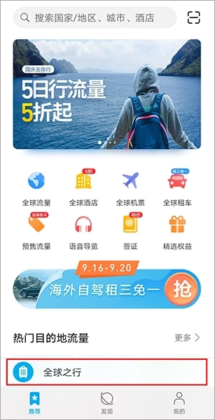 1、打开App,点击页面顶部"搜索栏"或点击"全球流量",搜索目的地;
