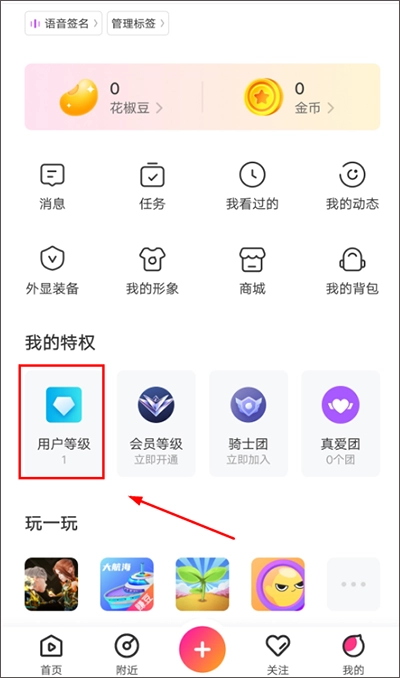[用户] -切换为[我的] - [用户特权] - [我的等级]