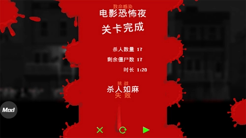 《恐怖僵尸之夜》包含丰富多样的模式,每个模式下又有诸多不同玩法。现在我们进入第一个经典的感染模式,选择“电影恐怖夜”关卡。该关卡的通关条件是感染3名人类,再消灭14名人类即可完成挑战。接下来,点击绿色的播放按钮就能开始游戏了。