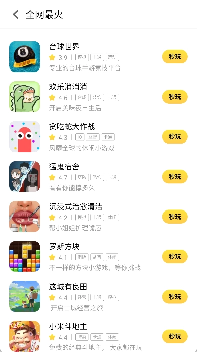 小米秒玩小游戏软件是一款稳定安全的手机小游戏平台应用,用户无需下载安装包就能直接启动游戏。平台拥有海量丰富的游戏资源,覆盖休闲、竞技、角色扮演等多种类型,还支持实时更新与自动适配不同手机型号,保障玩家获得优质的游戏体验。另外,正版应用具备智能推荐游戏、实时排行榜等功能,方便玩家轻松找到热门游戏。