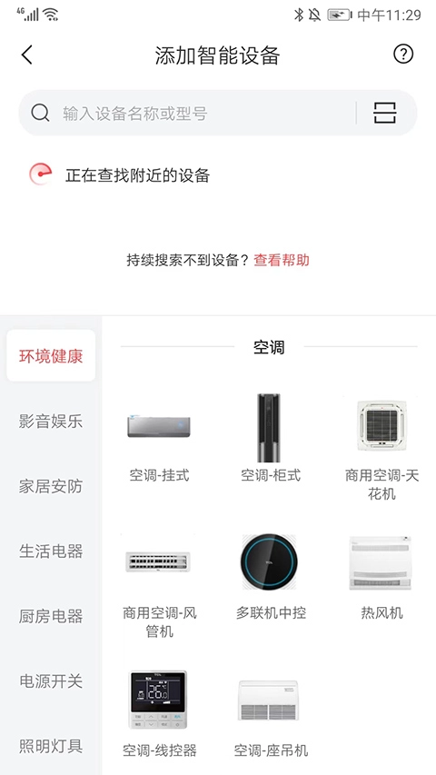 在设备界面,我们能够对设备进行管理,也可以通过输入设备名称、型号或者扫码的方式添加智能设备。