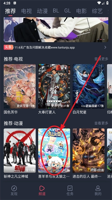 打开豚豚剧应用,找到并点击“频道”选项,然后从中挑选自己感兴趣的电视剧、电影等内容。