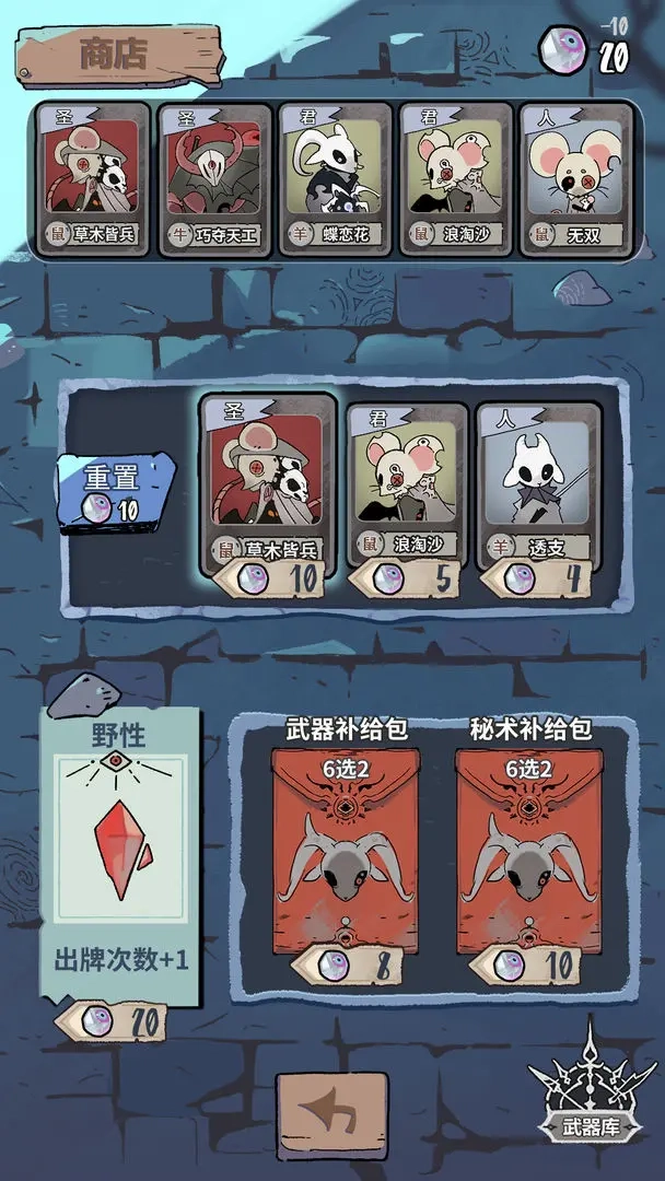 推荐武器方面,太刀和匕首是优先选择,因为它们搭配两张12倍卡能明显提高层数。当拥有50金币后,就可以开始购买武器了,要优先挑选太刀和匕首,并且尽量集齐同元素的武器来增强战斗力。