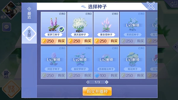 到达花园后,径直去买鲜花种子就好,这些种子的价格差异不大。要是想购买等级更高的鲜花,就得先提升角色的种植等级才行。另外,能买多少种子还和你拥有的花盆数量挂钩,别忘了,只有先买到鲜花种子,后续才能开展种植工作。