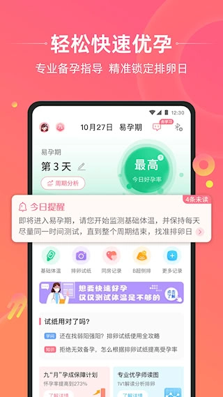 集成智能提醒功能,可依据个人周期特点,在每日需测量的清晨时段、推算出的易孕期以及其他关键日期自动推送通知,助力用户保持记录的连续性,同时不错过重要时机。