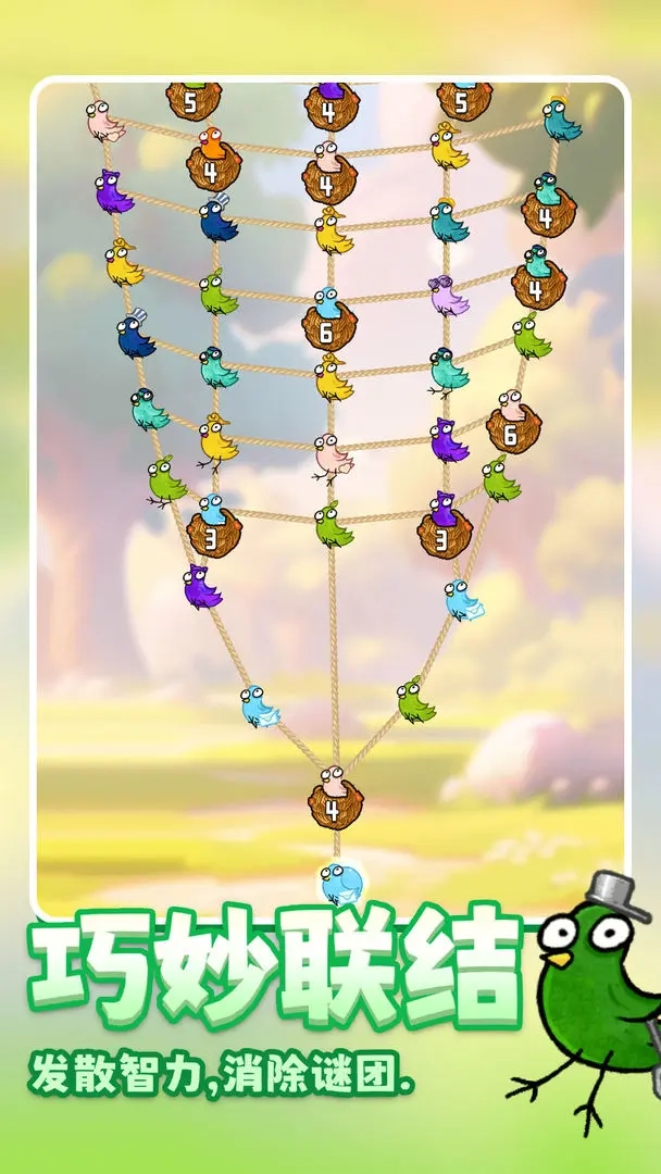 核心玩法:玩家要灵活操控手中的绳子,指引处于边缘位置的小鸡,把鸡蛋准确投放到颜色相匹配的鸡蛋筐里。