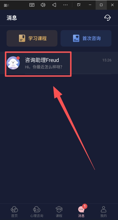 在消息中心页面,用户能够集中查看已购课程的学习进度和最新动态,还可以查阅与预约咨询师的对话记录及预约安排,便于用户统一管理各类学习与咨询事务。