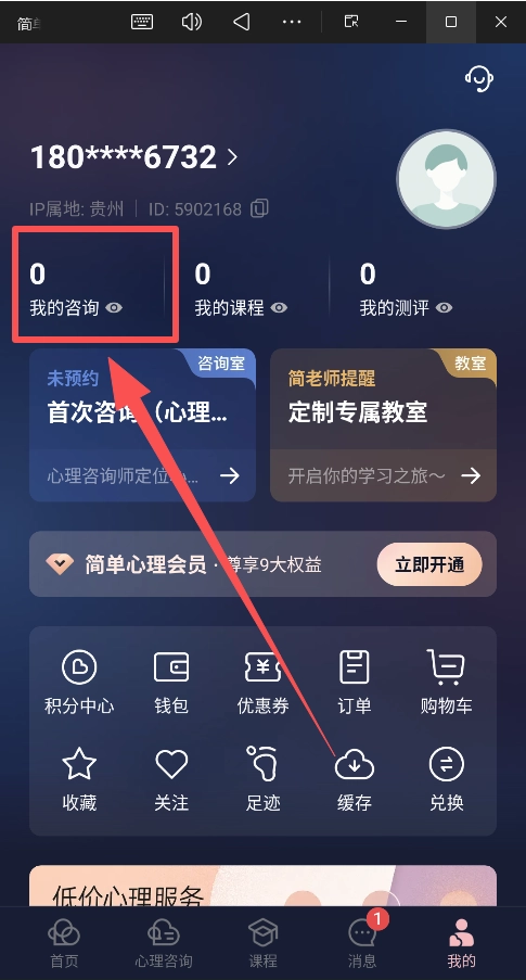 用户可以在消息页面查看已购入的课程以及咨询师的消息安排情况。