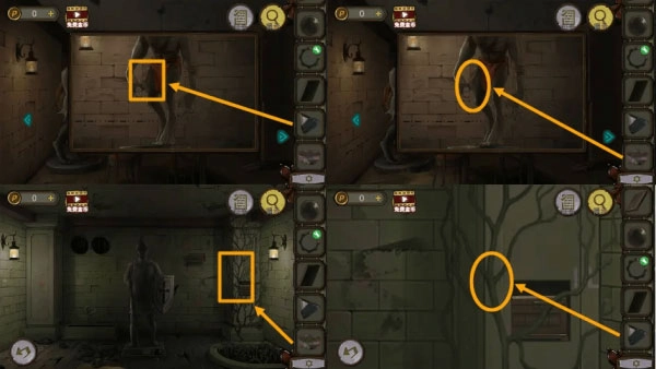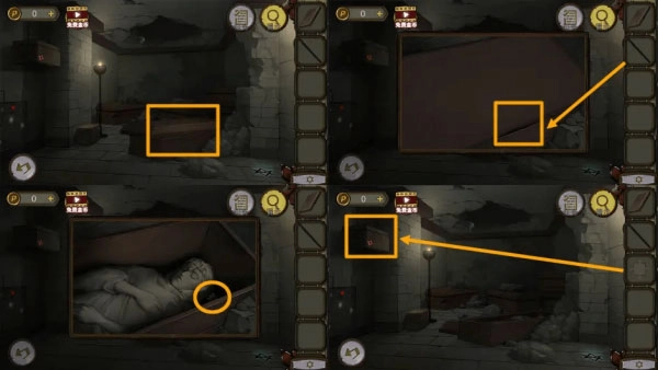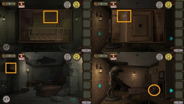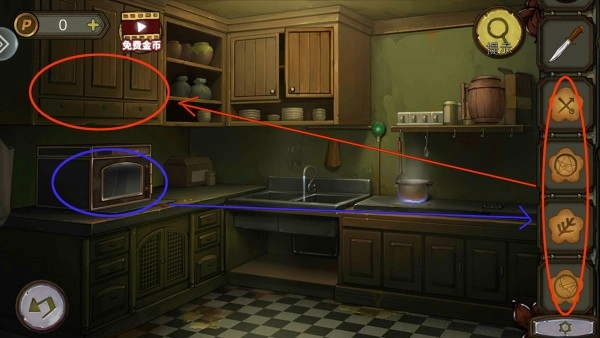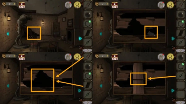 玩家进入地下室后,先点击镜子,这样就能拿到黑布。接着,玩家需要带着黑布去厨房,在水龙头处将其浸湿,然后用浸湿的黑布擦拭镜子。