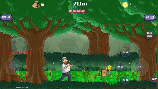 左下角的轮盘可操控戴夫移动,右侧设有各类功能菜单,涵盖闪避跳跃、近战、换弹射击以及拾取购买等操作选项。